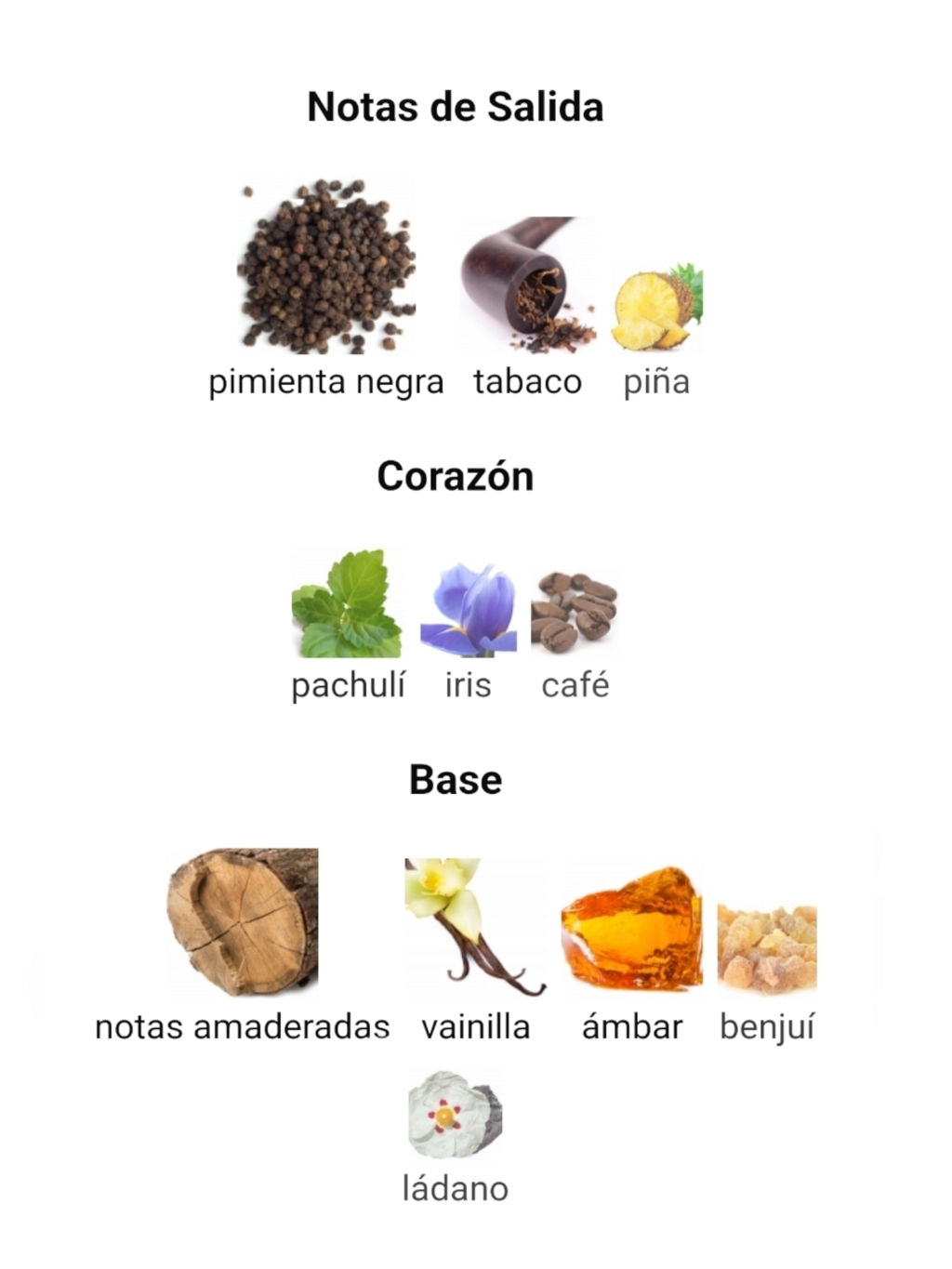Fondo: Vainilla, Ámbar, Benjuí, Ládano, Notas Amaderadas.